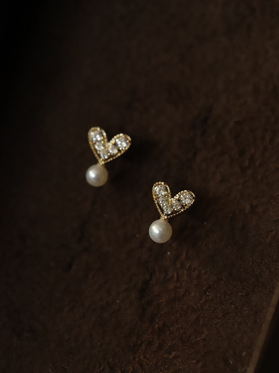 華やかな輝きを放つハートとパールピアス14Kゴルードシルバー925